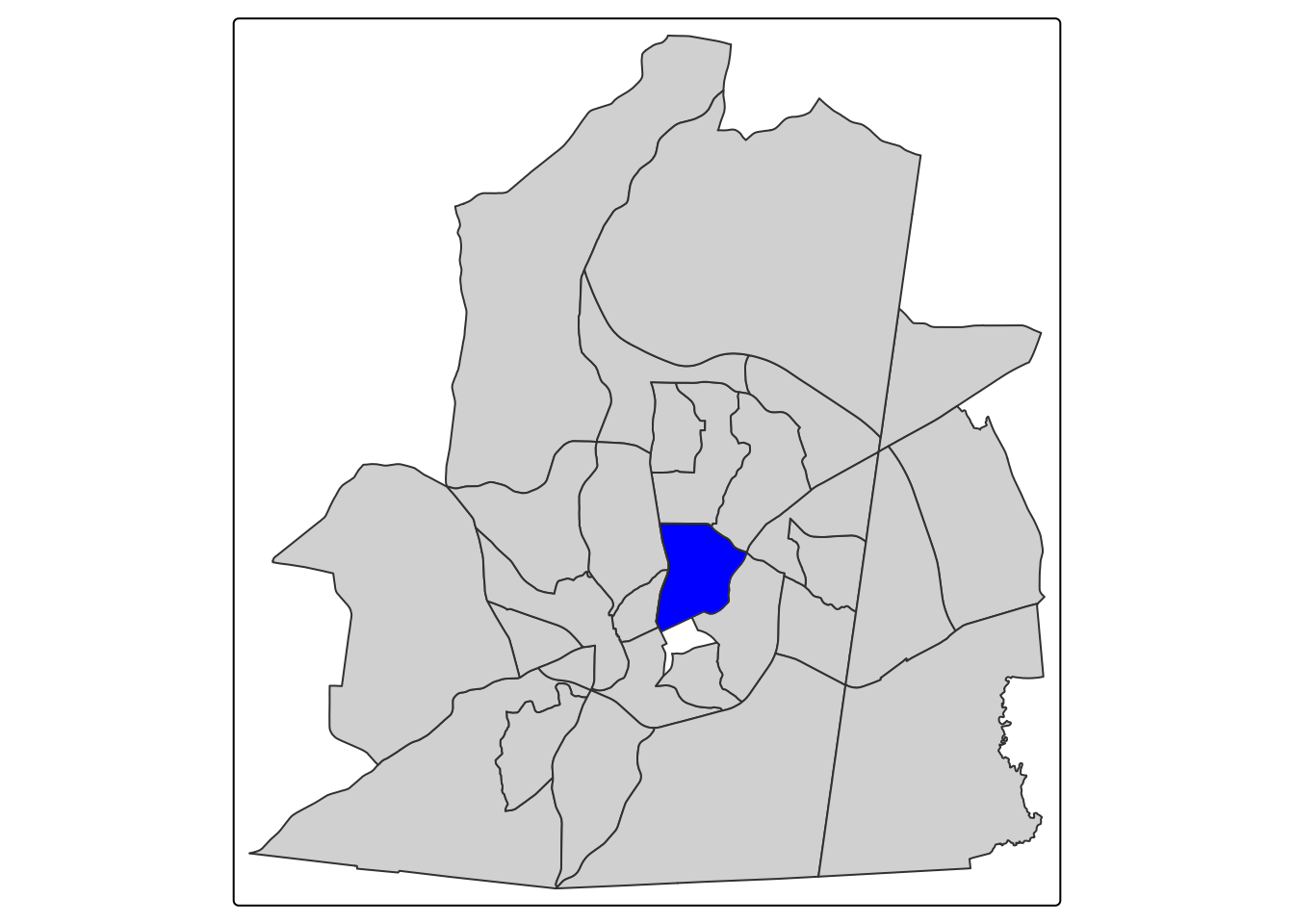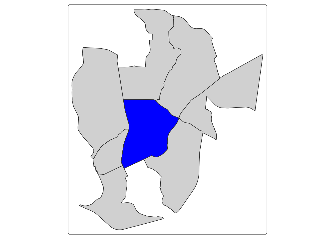 tm_shape(neighbors) + tm_polygons() + tm_shape(ch_tract) + tm_polygons(fill = "blue")