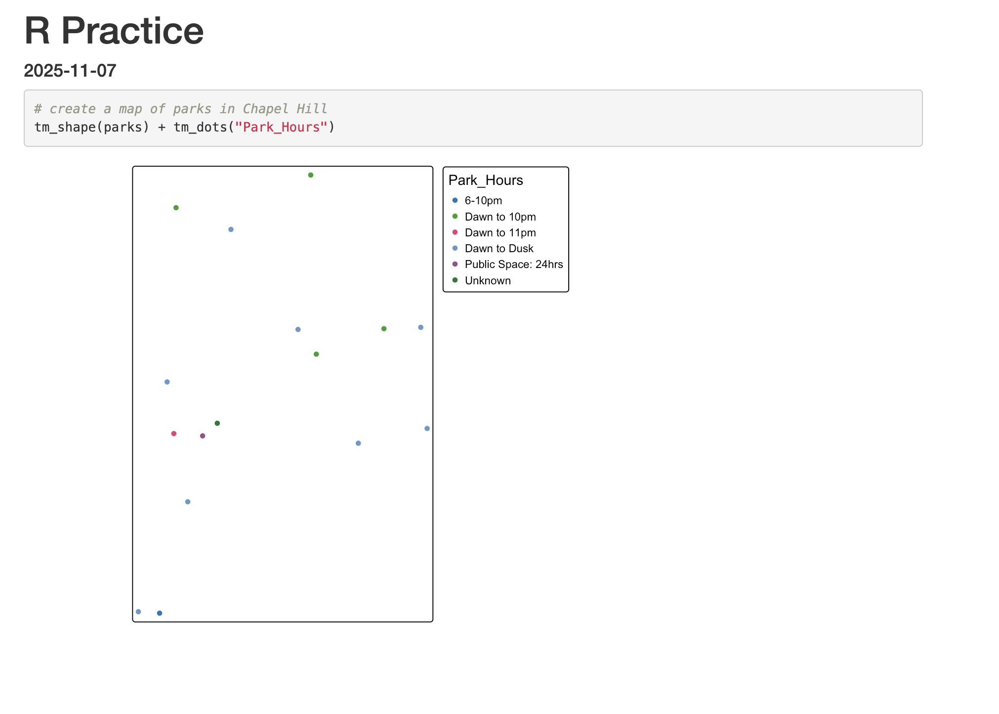 Add a new code chunk and add the code below to create your first map. Every command that you create should have a comment (#) above that explains what that command is doing. If you run that chunk, a map should appear below.