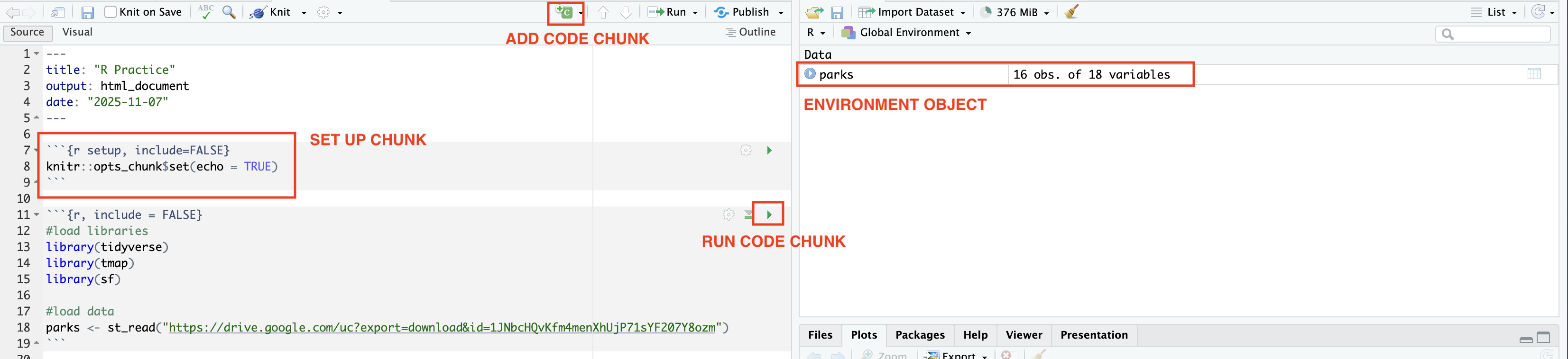 A .Rmd is made up of two main components: code chunks (this is where you write code) and text (any words that are outside of a code chunk). Any time you are writing code, it needs to be in a code chunk. Chunks can then be run to execute the code within the chunk. The idea of chunking is to group code that accomplishes a single, related task into one code chunk. When you begin a new step or process in your workflow, you start a new chunk.