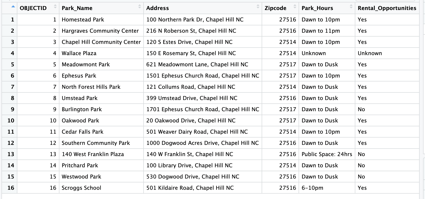 If everything is working, ‘parks’ should appear in your environment. The ‘parks’ dataset is now an “object”.