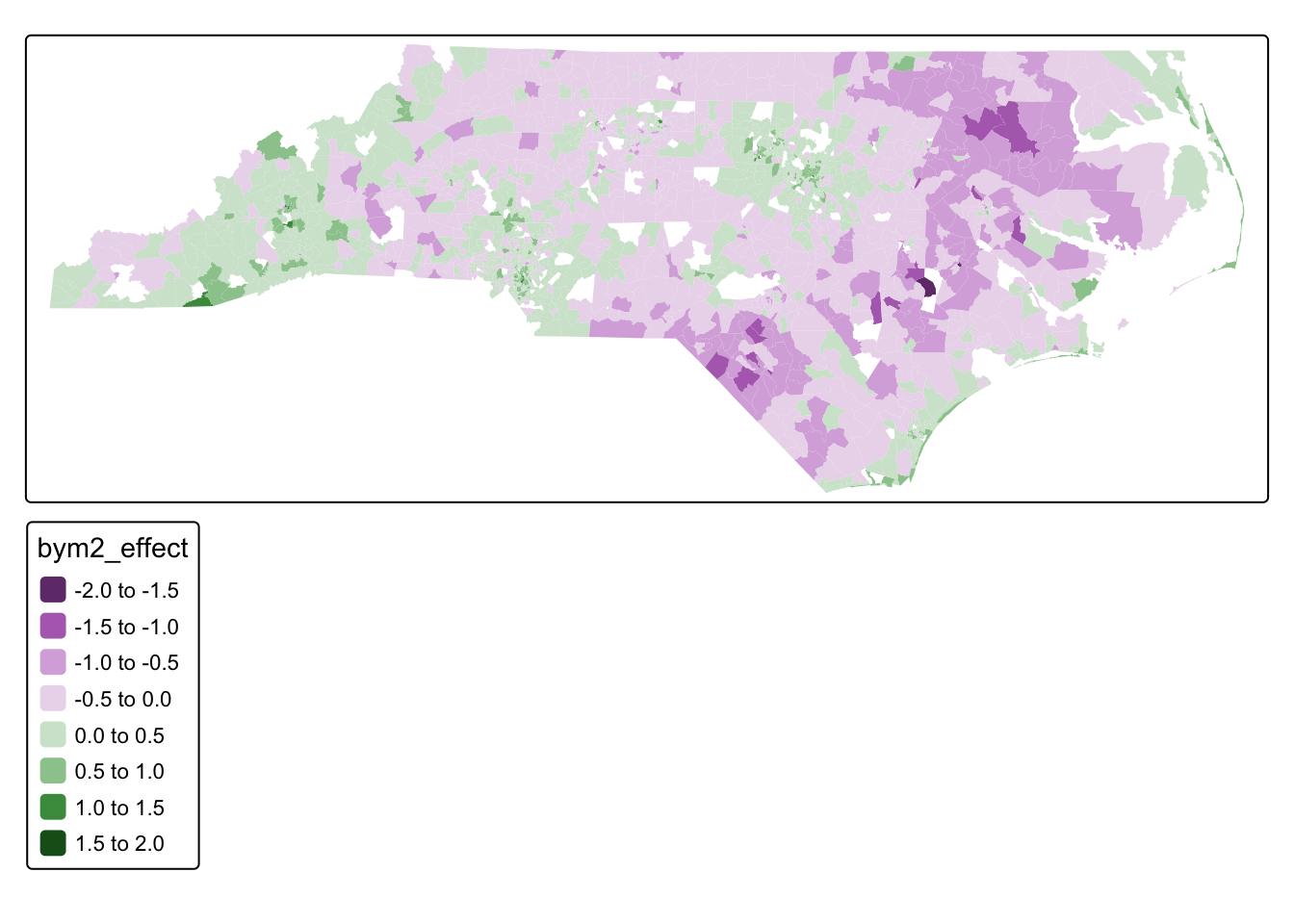 acs_tract_nc$bym2_effect <- res$summary.random$re_u$mean[1:n]Finally, we can make the predictions. Remember, this is logged home value.