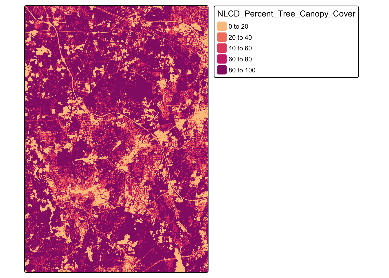 This data represents the percent of tree cover per 30-meter pixel. When we map the data, we can see the spatial pattern in tree canopy coverage across the Chapel Hill area