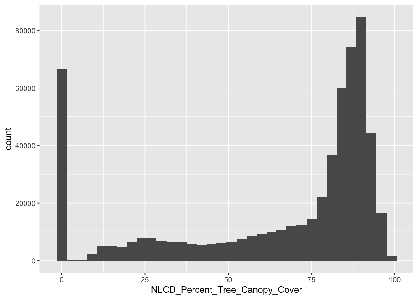 ggplot(canopy_raster_df, aes(x = NLCD_Percent_Tree_Canopy_Cover)) + geom_histogram(binwidth = 3)