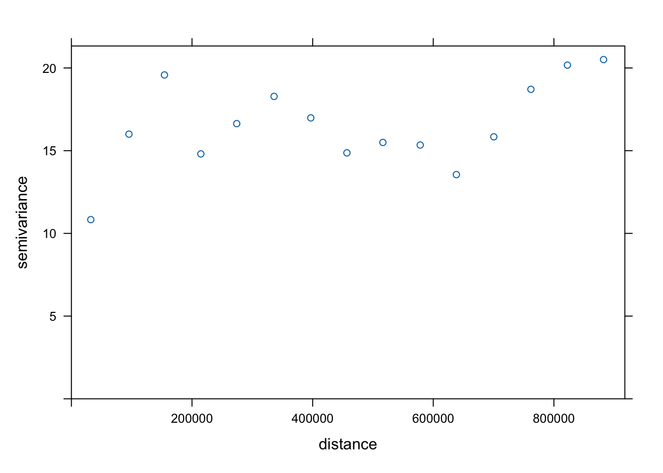 To understand the spatial structure of the data, we first calculate an empirical variogram on our data. The empirical variogram summarizes how differences between observed values change with distance by computing the average semivariance between pairs of observations at different separation distances.