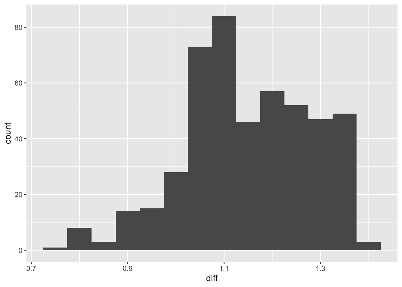 ggplot(summer_temp, aes(x = diff)) + geom_histogram(binwidth = .05)