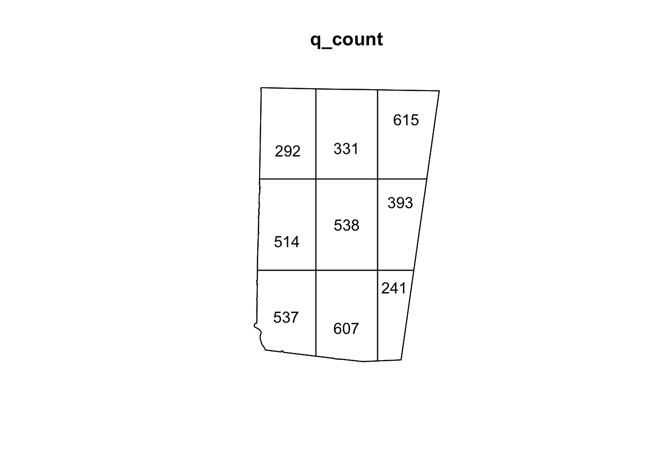 Q1: What do you notice about the quadrat counts (note that some of the quadrats are slightly smaller than others based on the boundaries of the county)?