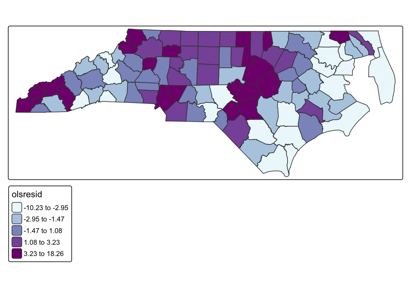 tm_shape(county_covid) + tm_polygons(fill = "olsresid",fill.scale = tm_scale_intervals(values = "bu_pu", style = "quantile", n = 5))Multiple palettes called "bu_pu" found: "brewer.bu_pu", "matplotlib.bu_pu". The first one, "brewer.bu_pu", is returned.