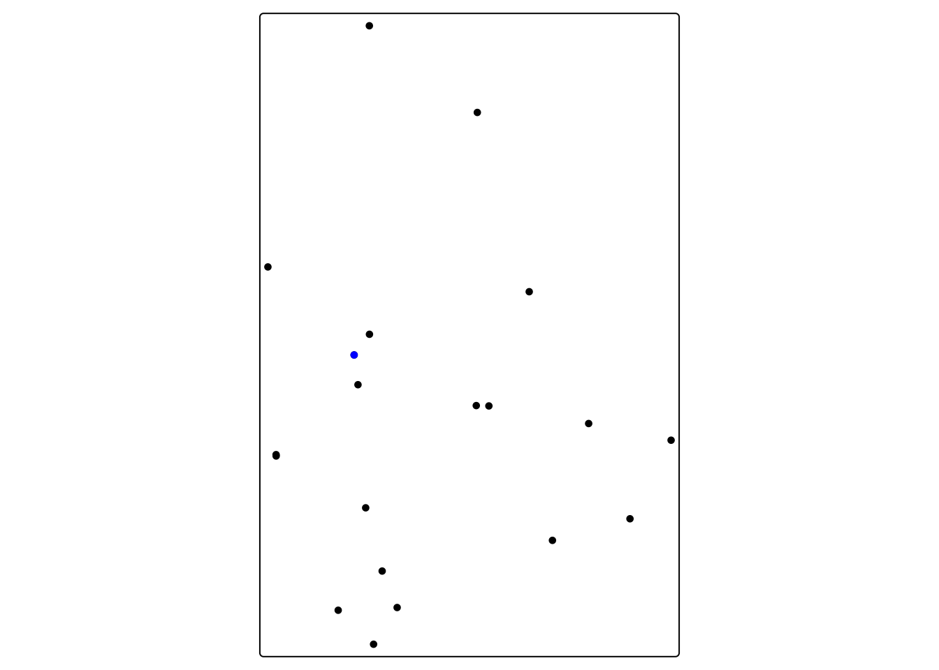 tm_shape(chhs_neighbors) + tm_dots() + tm_shape(chhs) + tm_dots(fill = "blue")