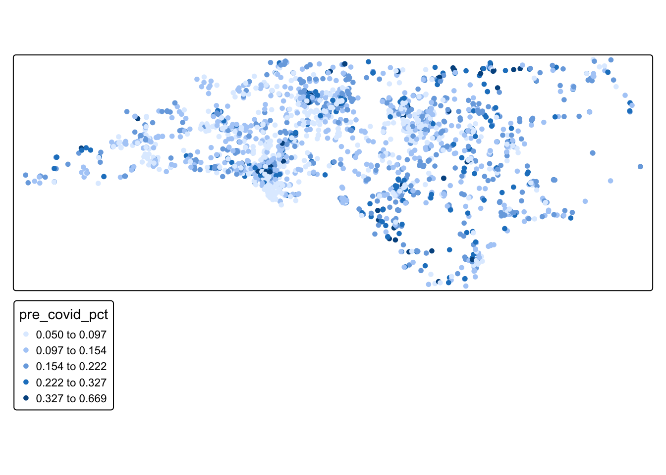 tm_shape(schools_sf) + tm_dots(fill = "pre_covid_pct", fill.scale = tm_scale_intervals(style = "fisher"), col_alpha = 0)