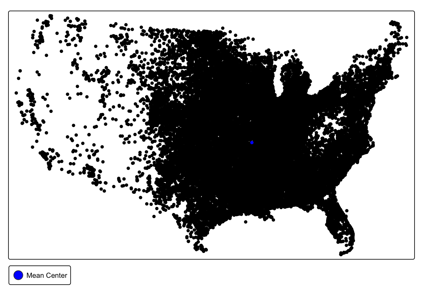 Q8. What does the location of our mean center tell us about the spatial distribution of tornadoes in the United States?