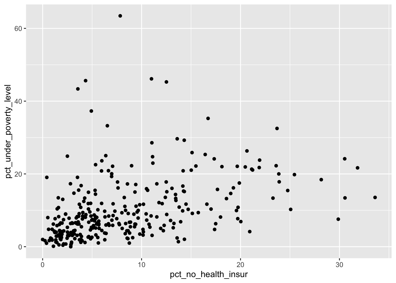 One of the simplest visualizations we can use to explore bivariate relationships is a scatterplot. For instance, if we want to explore the relationship between our no health insurance variable and our poverty variable, we could do the following