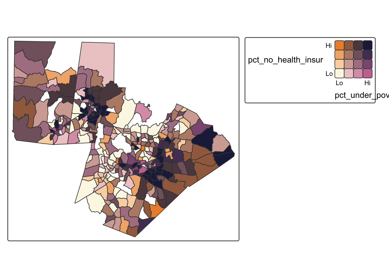tm_polygons(fill = tm_vars(c("pct_no_health_insur", "pct_under_poverty_level"), multivariate = TRUE),